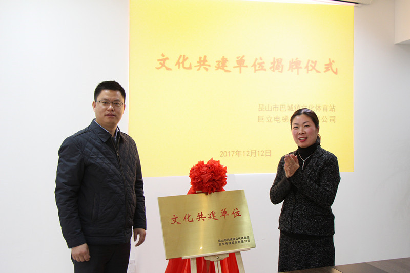 2017年12月12日,巨立电梯股份有限公司与昆山市巴城镇文化体育站结成文化共建单位,签署文化共建协议书,并举行揭牌仪式。巨立股份党支部书记鲍国庆与巴城镇文化体育站站长王新娟、党支部书记申厚军分别带领双方党支部成员参加揭牌仪式,并举行交流活动。